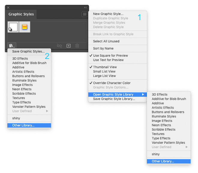 - Mở Graphic Style panel (Window > Graphic Styles). Click chọn đối tượng đã áp hiệu ứng và click vào dấu