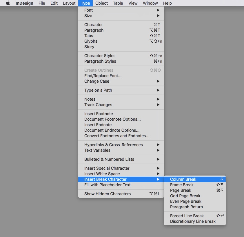 Đó là break collumn, hoặc break page là ngắt luồng text sang trang mới,.. Đó là tính năng break character (Type > insert break character)