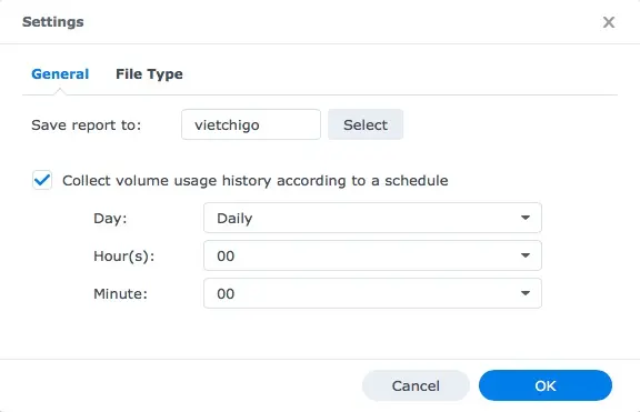 Click vào Settings, chọn thư mục lưu và tuần suất báo cáo.