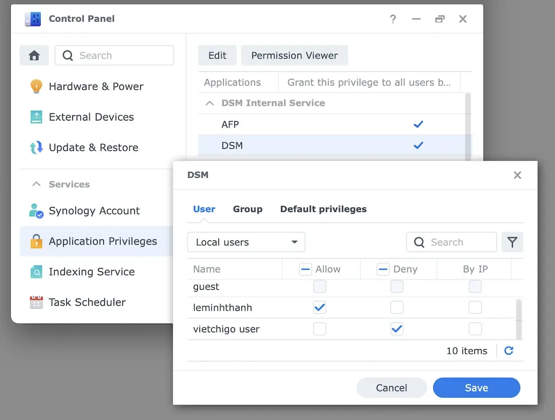 Truy cập Application Privileges trong Control Panel. Tìm mục nào mà bạn muốn truy cập. Ví dụ không truy cập vào ds qua trình duyệt