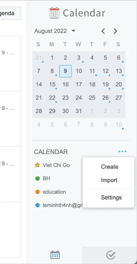 Và để export calendar nào bạn mở option menu bằng cách click vào tam giác nhỏ bên phải calendar đó trong sidebar bên phải giao diện.