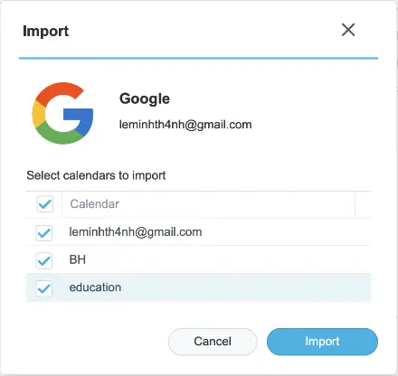 Bạn có thể import trực tiếp google calendar hoặc từ file ics xuất từ google calendar