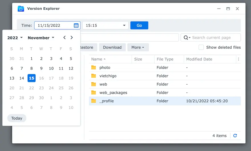 - Ở bản version nào thấy data xuất hiện trong thư mục thì click Download hoặc Restore để lấy data từ bản backup