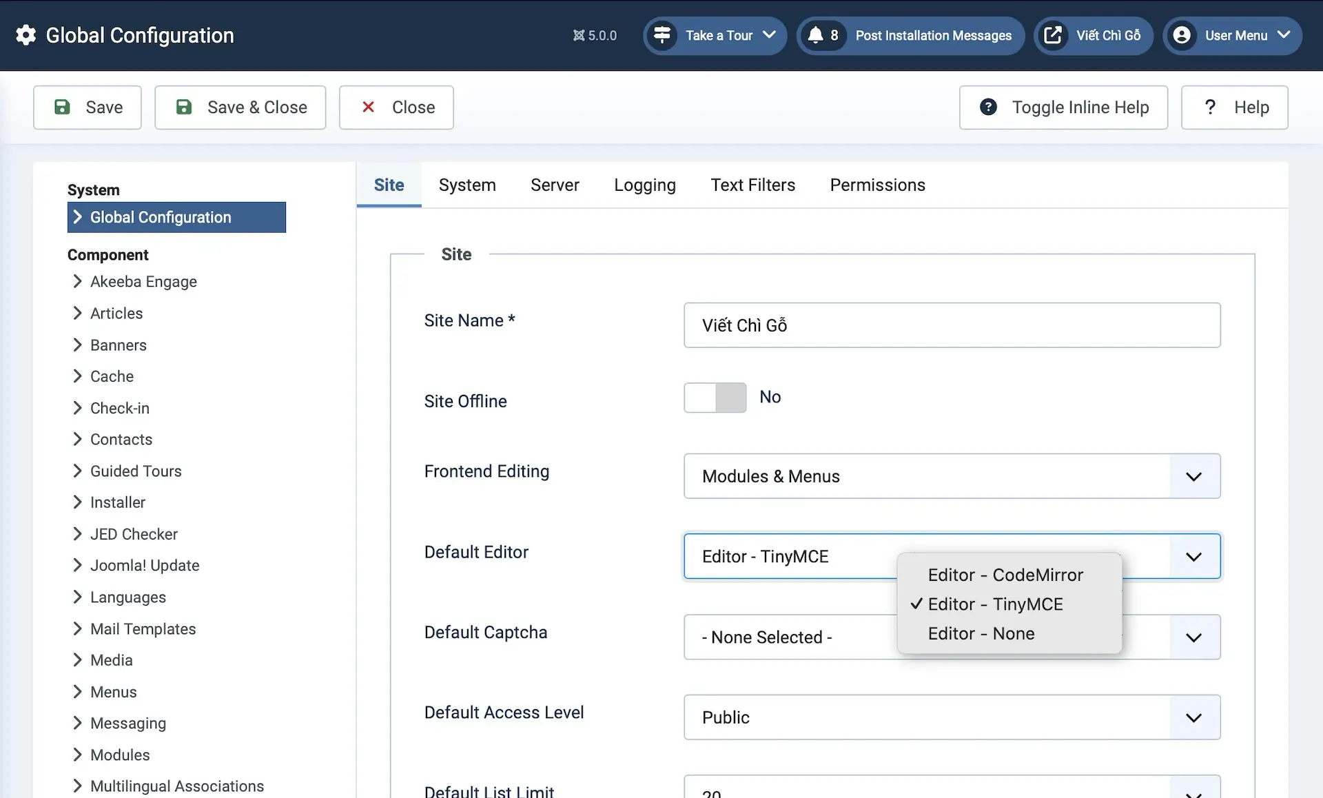 Truy cập vào Global Configuration > Site: Site Settings > Default Editor