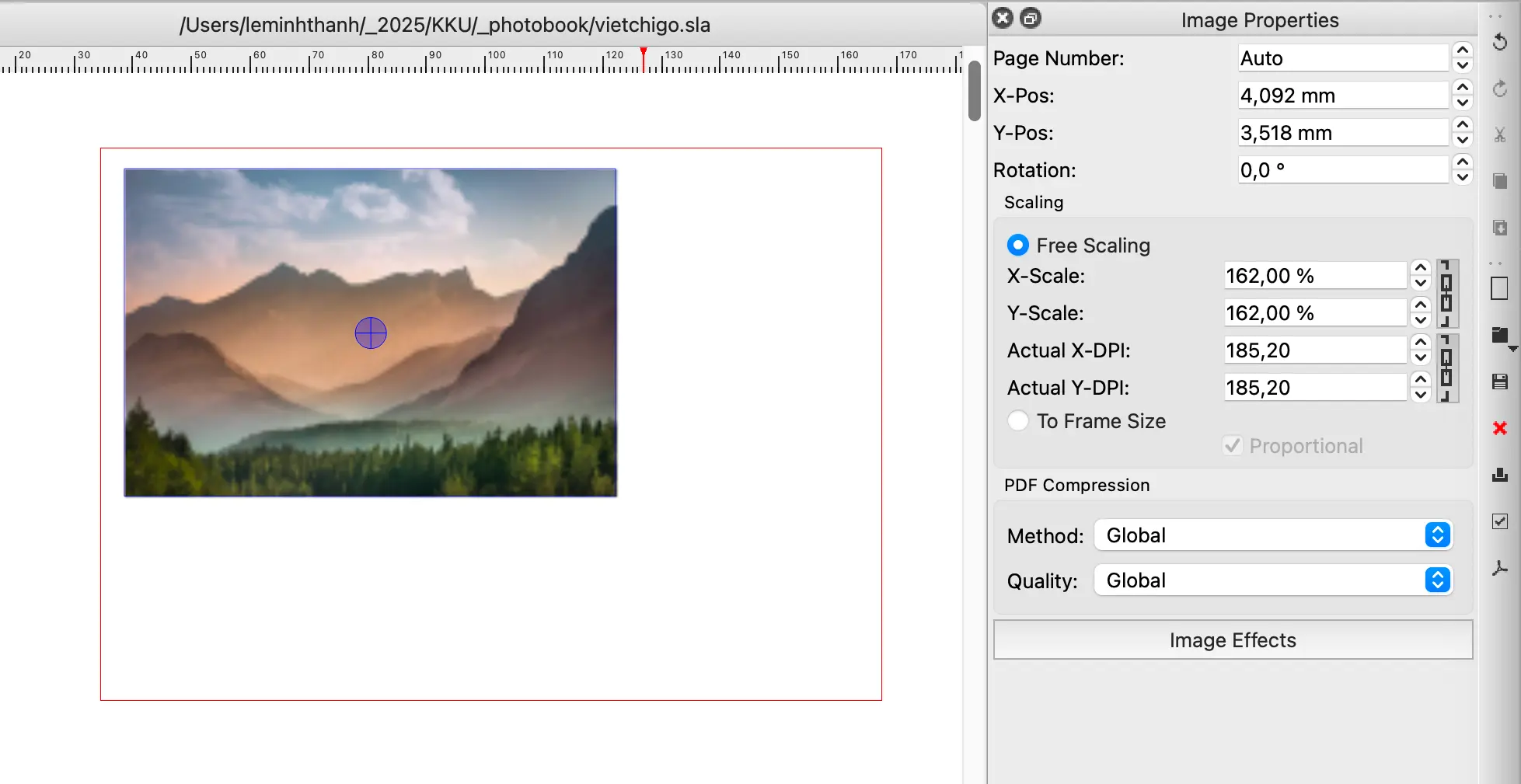 Sau khi place ảnh vào layout, bạn không cứ mặc tình phóng to thu nhỏ ảnh cho vừa với frame hình là được. Từ kích thước thật của ảnh trên layout (ổn định) bạn chỉ được phóng to tối đa 25%