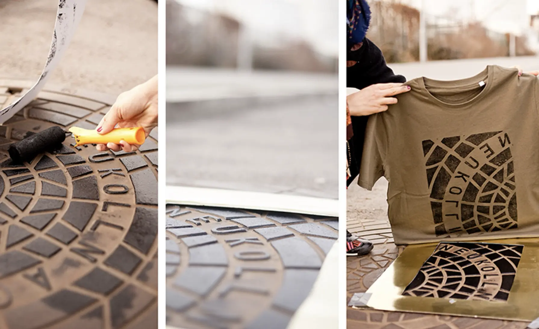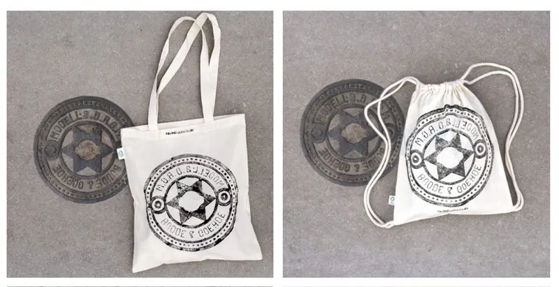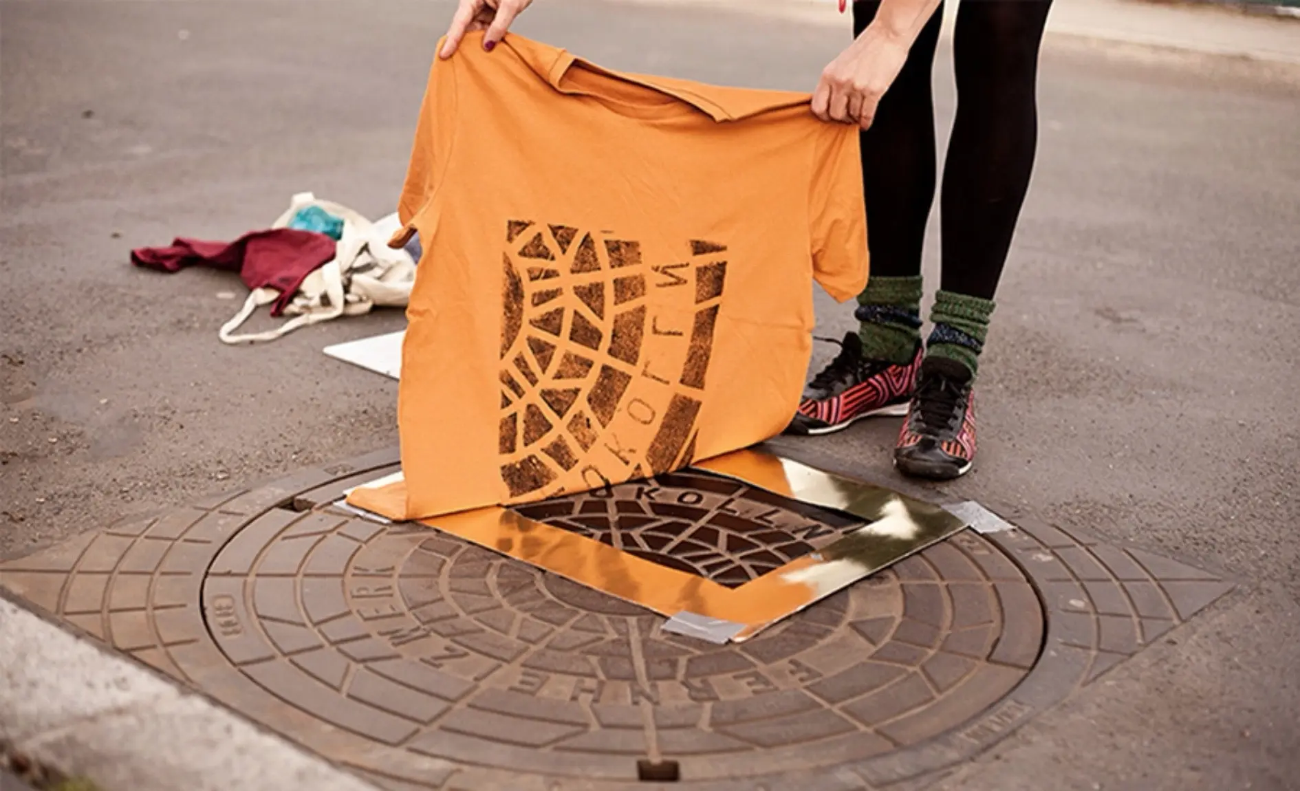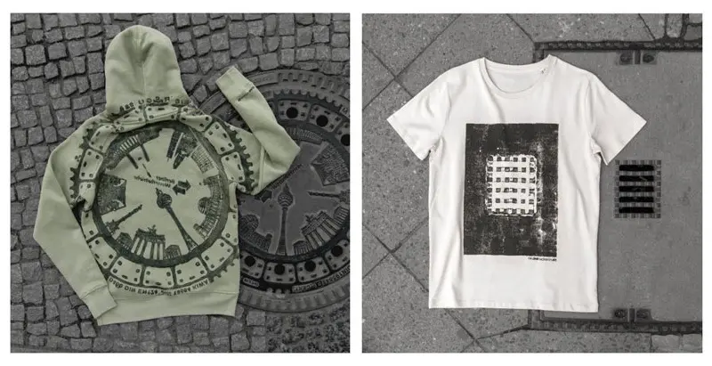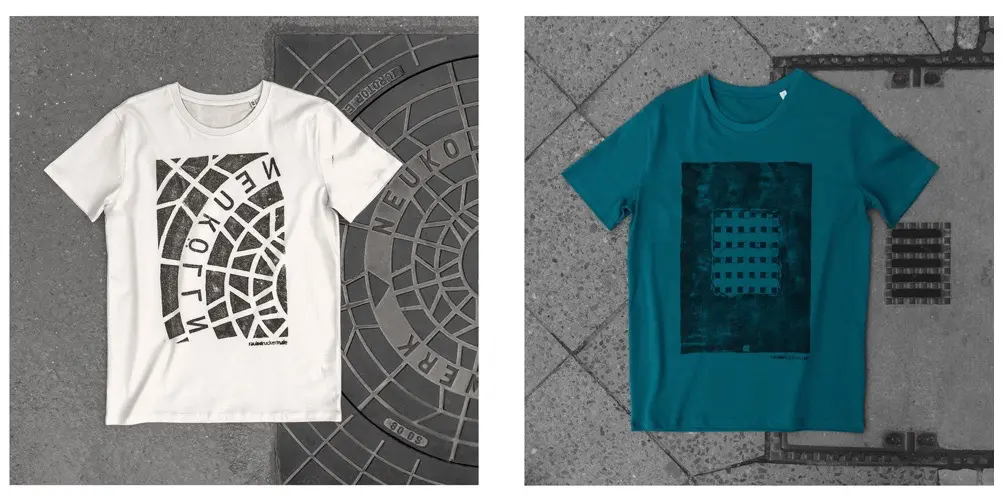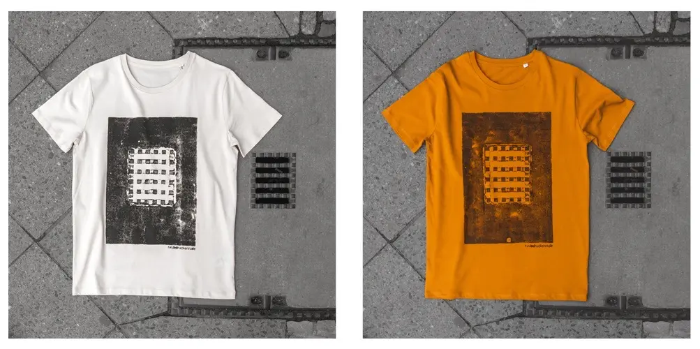 Bộ sưu tập độc đáo của nhóm nghệ sĩ người Đức có tên là Raubdruckerin là các mẫu áo thun, túi xách,.. được in bằng phương pháp cực kỳ thô sơ và ít tốn kém nhất: mực, con lăn, mảnh thiết và... nắp cống trên đường phố