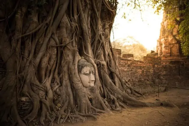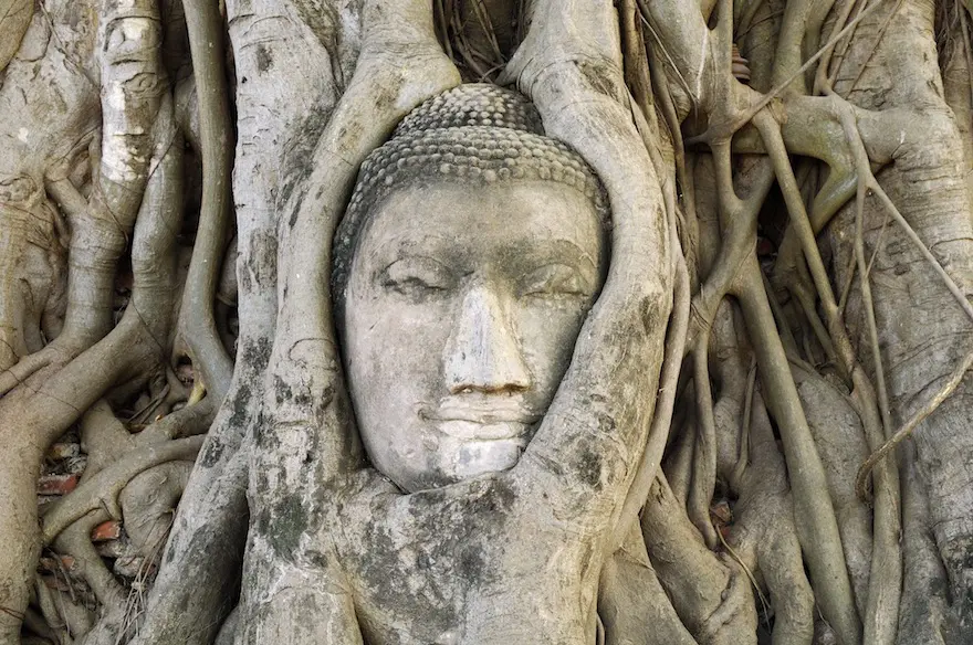 Có một tượng đầu đức Phật trông có vẻ như xuất hiện và mọc lên từ rễ cây. Bức tượng này gần ngôi đền thế kỷ thứ 14 tên là Wat Mahathat ở Ayutthaya, đã từng là thủ đô của người Xiêm La, ngày nay là Thái Lan. Năm 1767, một đội quân Miến Điện đã tấn công và tàn phá ngôi đền bằng cách cắt đầu các tượng Phật làm đền thờ bị hư hại trầm trọng.