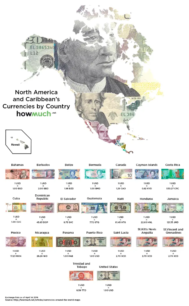 Trong bản đồ tiền tệ khu vực Bắc Mỹ thể hiện tỷ giá hối đoái so với đồng USD của 21 quốc gia khác nhau. Đồng tiền mạnh nhất là đồng đô la Quần đảo Cayman (Cayman Islands). Tỷ giá hối đoái của đồng đô la Quần đảo Cayman là 0,82 đổi 1 USD. Đồng tiền yếu nhất là đồng tiền Gourde Haiti. 1 USD tương đương với 61,4 Gourde Haiti. Quần đảo Cayman là nước duy nhất có đồng tiền mạnh hơn so với đồng USD.