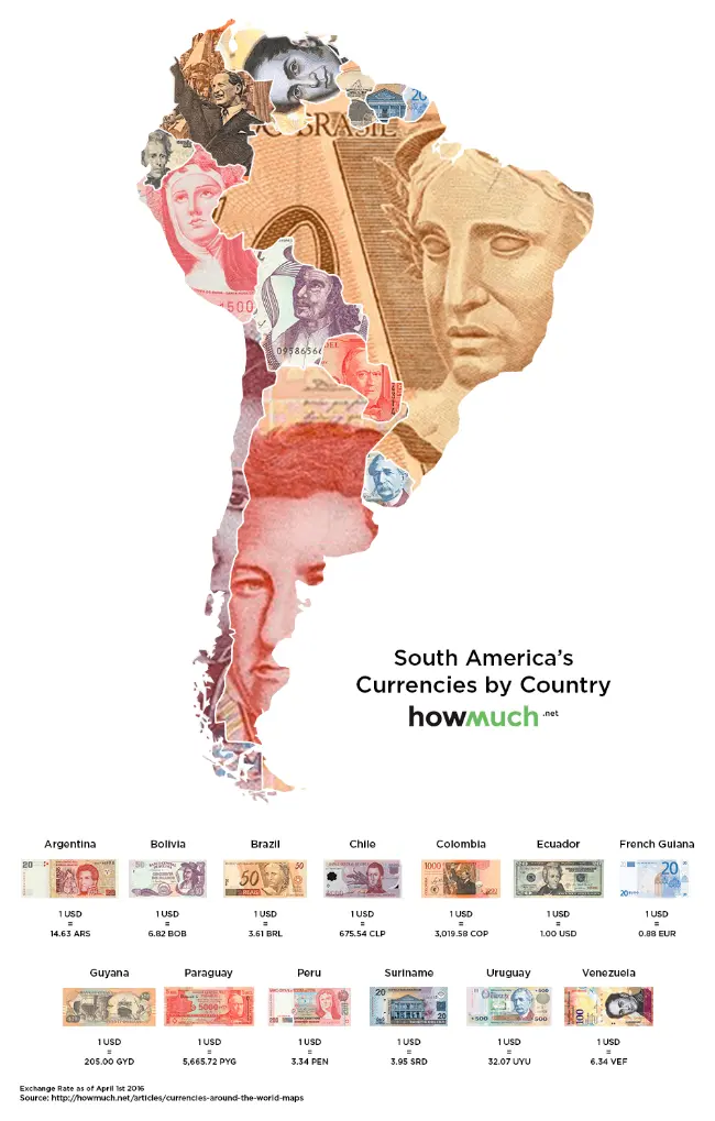 Bản đồ tiền tệ khu vực này biểu thị tỷ giá hối đoái của 13 quốc gia. Đồng tiền mạnh nhất là đồng tiền của Guiana (thuộc Pháp). Quốc gia này sử dụng đồng Euro, trong đó 1 USD = 0,88 Euro. Đồng tiền yếu nhất là Guarani Paraguay, 1 USD tương đương với 5.666 Guarani Paraguay. Guiana thuộc Pháp là quốc gia duy nhất có đồng tiền mạnh hơn so với USD