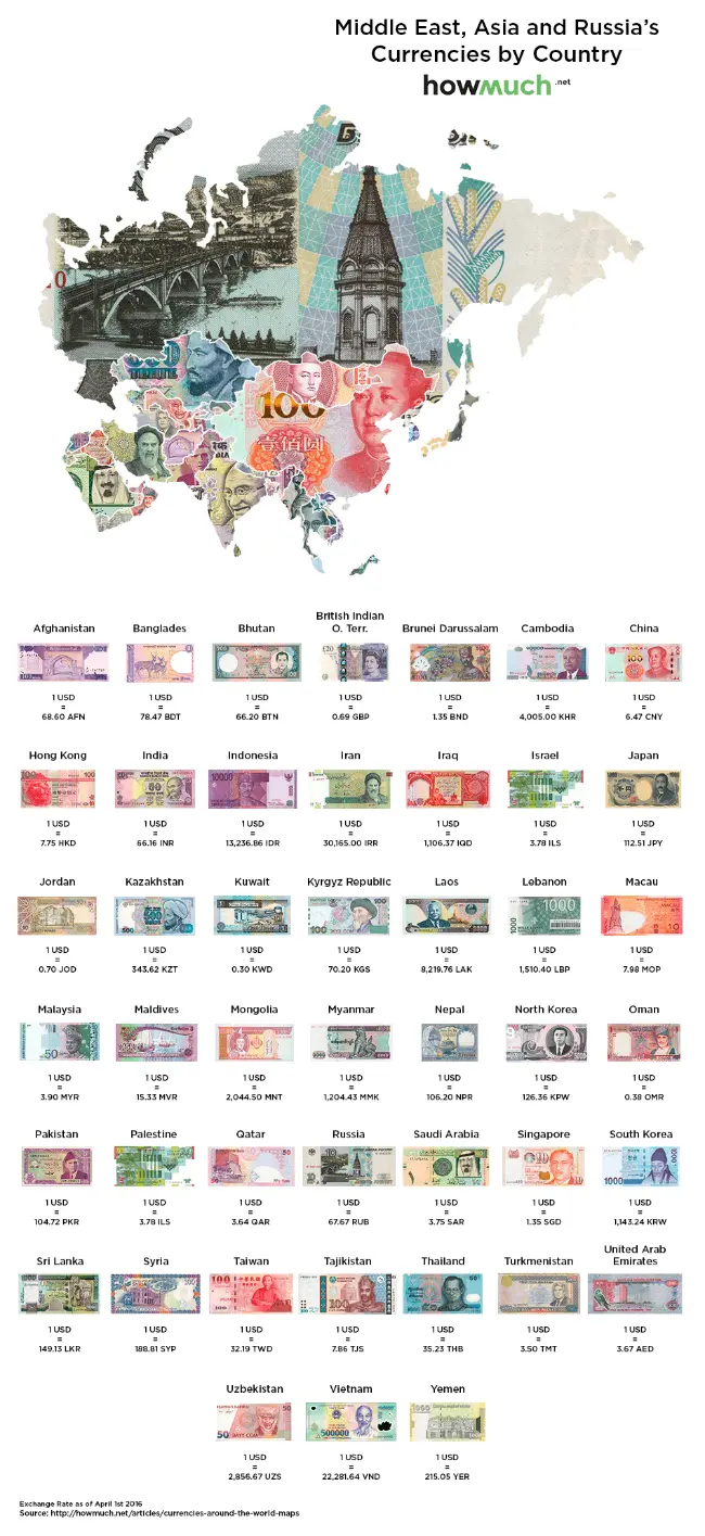 Bản đồ dưới đây thể hiện tỷ giá hối đoái của 45 quốc gia. Trong đó, đồng tiền mạnh nhất khu vực Trung Đông, châu Á và Nga là đồng dinar Kuwait. Tỷ giá hối đoái của đồng dinar Kuwait là 0,30 đổi 1 USD. Đồng tiền yếu nhất là rial của Iran, 1 USD tương đương với 30.165 rial Iran. Trong bản đồ, 4 quốc gia có đồng tiền mạnh hơn so với đồng USD là: Kuwait, Oman, lãnh thổ Ấn Độ Dương thuộc Anh và Jordan.