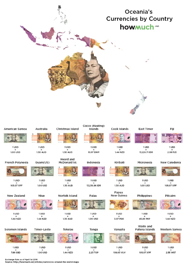 Quốc gia có đồng tiền mạnh nhất khu vực này là Palau, sử dụng đồng USD làm đồng tiền của mình. Đồng tiền yếu nhất là Vatu Vanuatu, 1 USD tương đương với 109,9 Vanuatu Vatu. Không có quốc gia có đồng tiền mạnh hơn so với đồng USD tại đây.