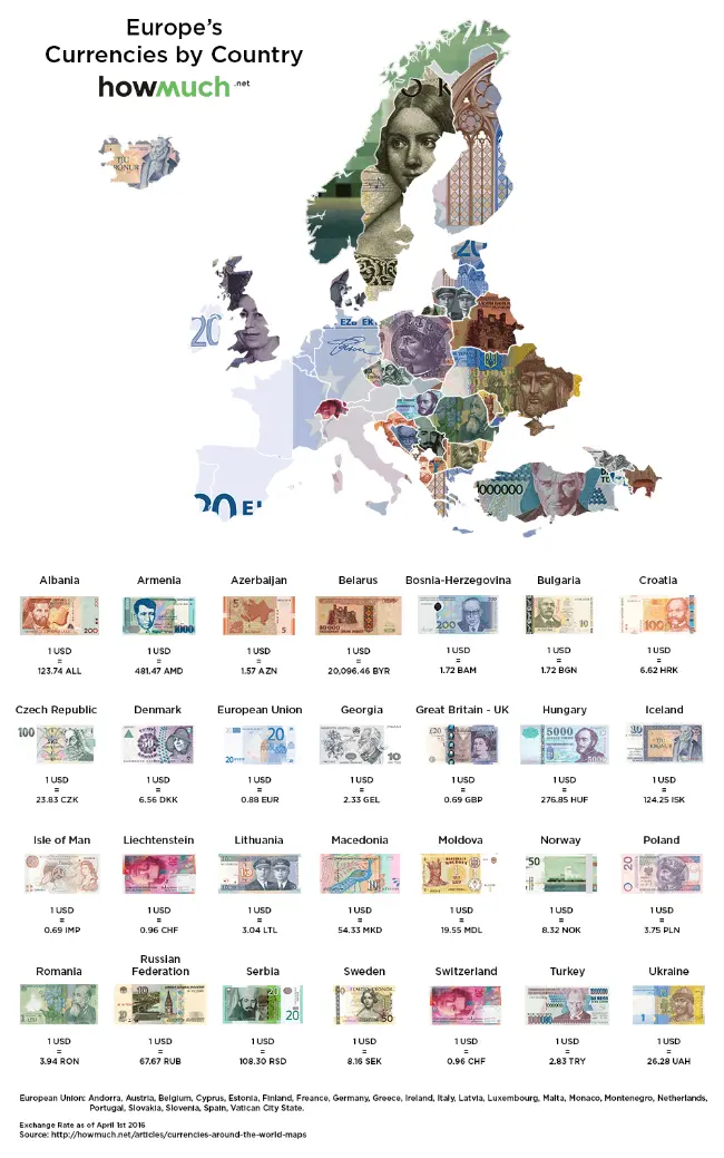 Tỷ giá hối đoái của 27 quốc gia khác nhau được thể hiện trên bản đồ tiền tệ châu Âu. Đồng tiền mạnh nhất thuộc về tiền tệ của Isle of Man - đất nước này sử dụng đồng bảng Manx, trong đó có một tỷ giá 1 USD = 0,69 bảng Manx. Đồng tiền yếu nhất là đồng rúp Belarus, 1 USD tương đương với 20.096 đồng rúp Belarus. Trong bản đồ này, 5 quốc gia có đồng tiền mạnh hơn so với đồng USD: Isle of Man, Anh, Liên minh châu Âu, Liechtenstein và Thụy Sĩ.