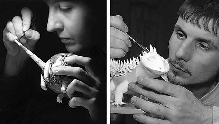 Hai nghệ sĩ người Ukraine: Anya Stasenko và Slava Leontyev tạo ra những sinh vật kỳ dị bằng sứ tí hon. Họ vẽ bằng màu sắc hòa trộn với trí tưởng tượng bay bổng để làm nên những chi tiết đầy màu sắc đáng kinh ngạc. Hầu hết các tác phẩm này có kích thước từ 4 - 40 cm