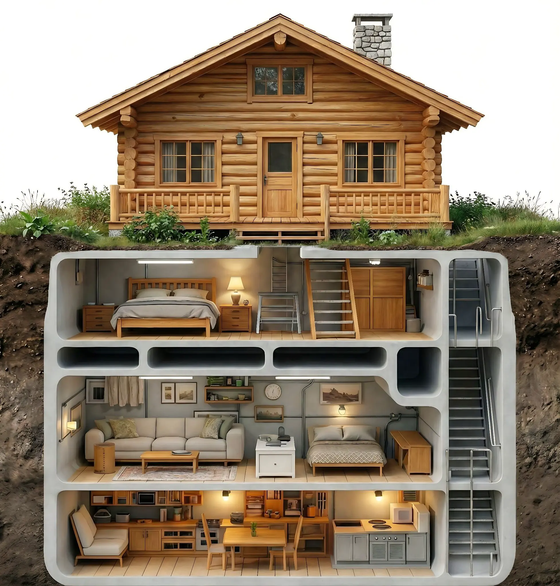 a conceptual cross-section (or "cutaway") illustration of a multi-level dwelling. It contrasts a traditional, rustic exterior with a highly organized, modern underground bunker system.