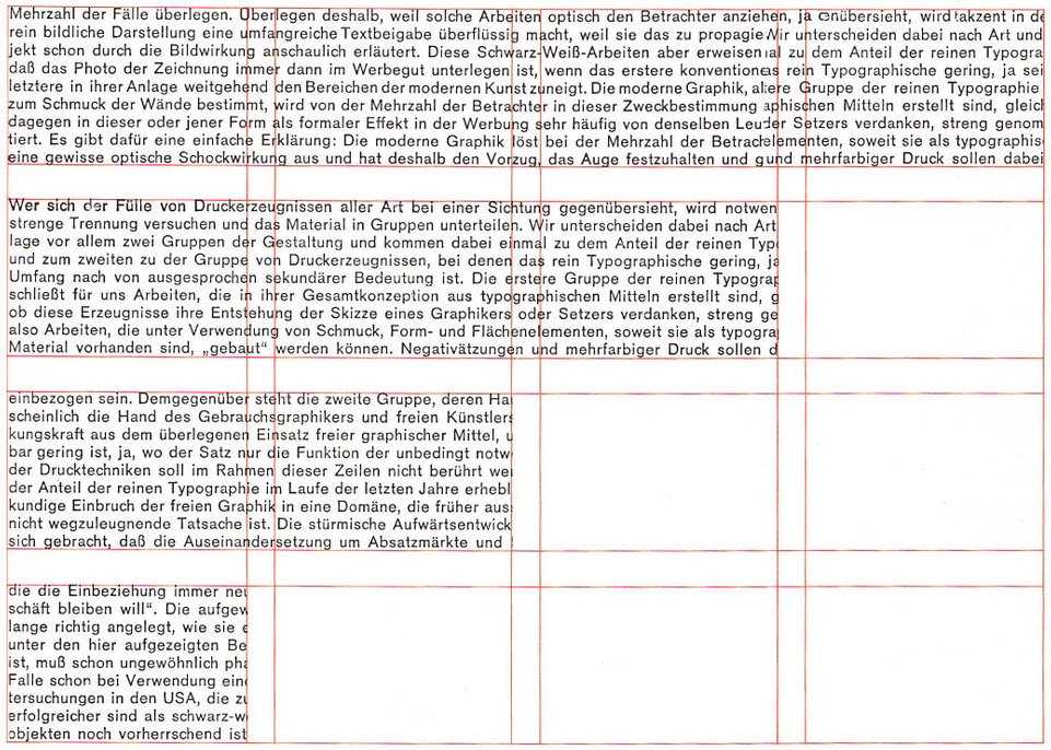 As graphic design evolved from a printmaker’s task in the 1920’s to a flourishing profession in the 1950’s, these geometric composition techniques matured with it. In 1928, Jan Tschichold released Die Neue Typographie, a strict modernist manifesto that argued for the use of sans-serif typefaces and uniform, left-aligned grid layouts. Although Tschichold did not use the word grid nor formalize its use, most of the techniques of the modern grid system were present: The division of the canvas into smaller, uniform rectangles to guide the text on the page.