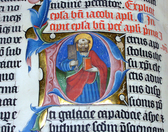 A picture of the Malmesbury Bible where the underlying grid clearly stands out next to the Gothic script and illustrations.