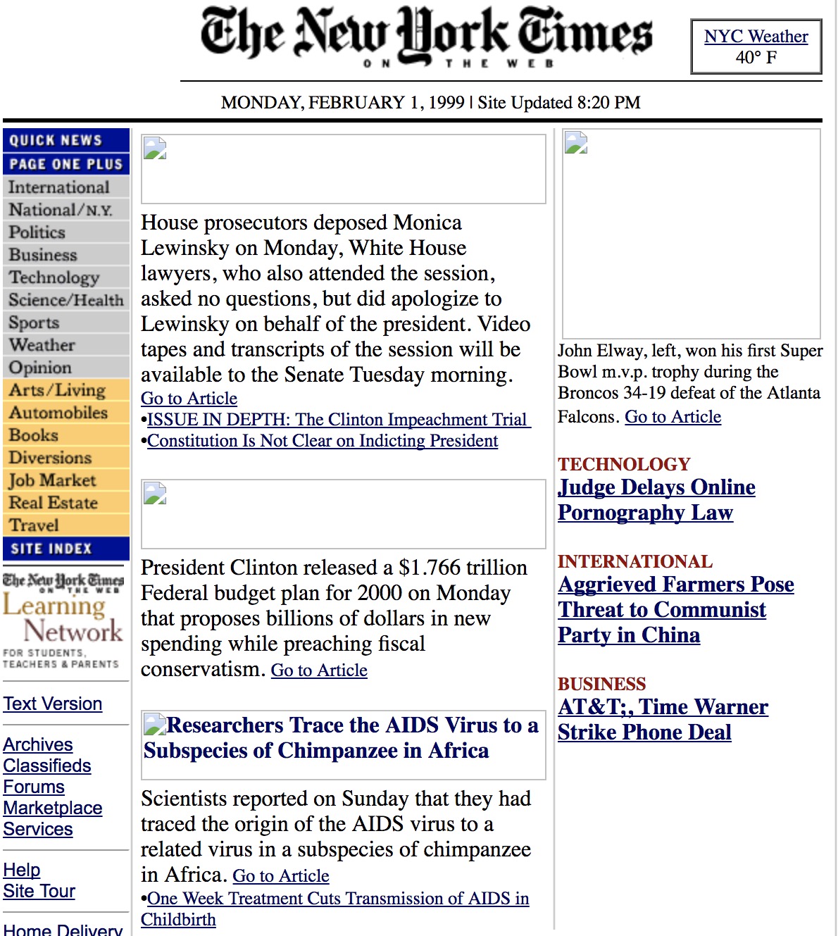 The New York Times website on February 1, 1999. ©