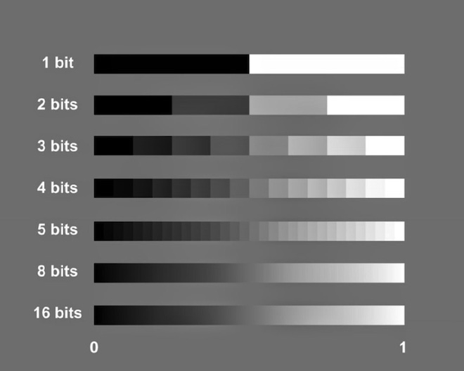 Ảnh 8 bit màu có nghĩa là mỗi kênh màu có 28 = 256 bước màu từ trắng tới đen, ảnh RGB có 3 kênh màu nên sẽ là 8 bit x 3 = 24 bit = 224 = 16.7 triệu màu tương đương với thang độ xám có 216 bước màu. Như vậy ảnh 16 bit sẽ có số bước màu gray scale là 216 nhiều hơn 28 = 256 bước màu rất rất nhiều.