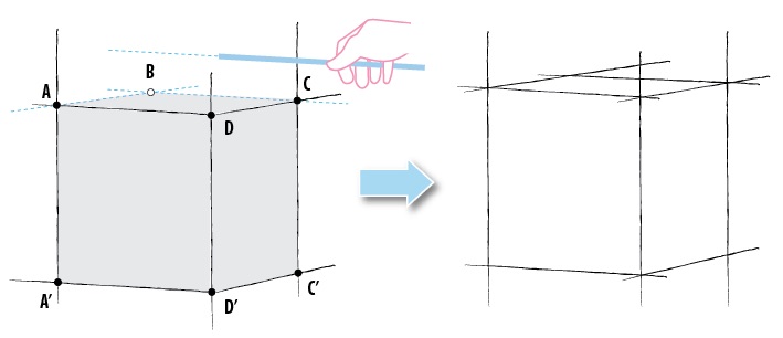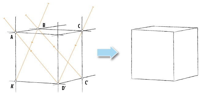 Vẽ hình lập phương thực chất là xác định vị trí các đỉnh (A, B, C, D, A', D', C') của trên trang giấy rồi từ đó nối chúng lại với nhau để thành hình lập phương. Tuy nhiên trong phép dựng hình thì các đường và điểm liên quan nhau cần phải được xác định cùng 1 lượt