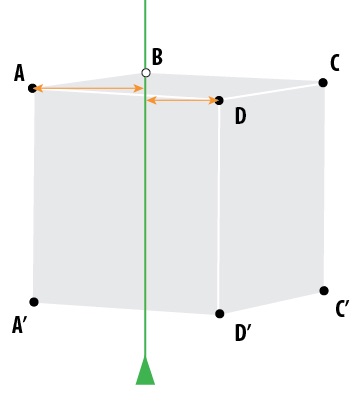 - Xác định phương của 3 cạnh đứng của hình lập phương: dùng dây dọi gióng xem các cạnh đứng của hình khối lệch thế nào với phương thẳng đứng của dây dọi. Trường hợp này thì chúng gần song song nhau và đi qua 3 điểm trên phép đo ở trên