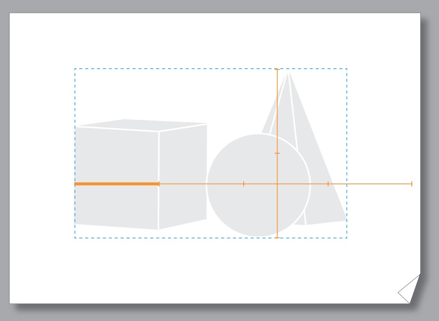 Bước 1: Chọn đơn vị đo Ở đây tôi chọn bề ngang mặt bên trái hình khối lâp phương làm đơn vị (gọi tắt là 1) thì đoạn que đo đó sẽ có chiều dài là 100 mm trên trang giấy, ví dụ như vậy. thì chiều dài cả 3 khối là khoảng 3,2 (đơn vị đo) và chiều cao của chúng là 2. Đem 1 khung bao có tỉ lệ kích thước 3,2 x 2 này vào trang vẽ và sắp xếp sao cho vừa mắt nhất.