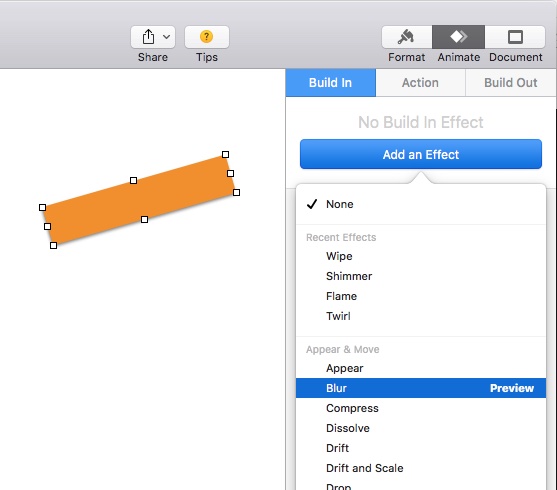 Áp hiệu ứng xuất hiện, biến đổi hay biến mất khá tương tự nhau. Ảnh trên là áp hiệu ứng Blur (mờ rõ) cho hiệu ứng xuất hiệu hình chữ nhật màu cam.