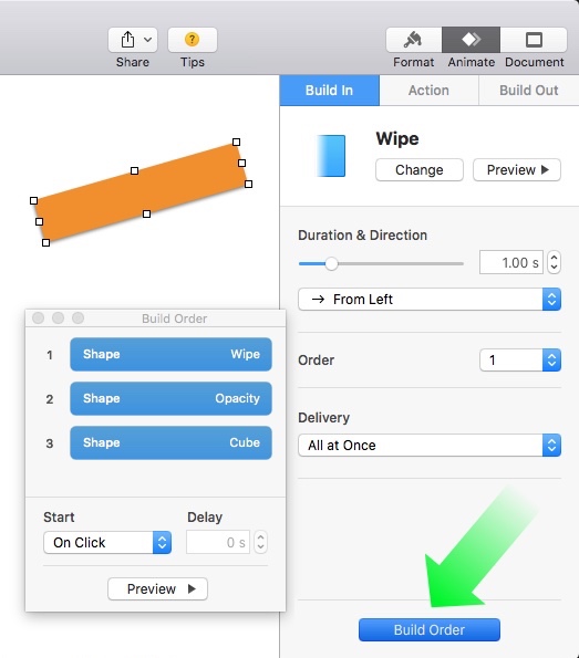 Bằng cách click và kéo các thanh hiệu ứng trong hộp thoại Build Order, bạn có thể thay đổi thứ tự thời gian các chuyển động xảy ra. Bạn cũng có thể gán sự kiện gây ra chuyển động đó như
