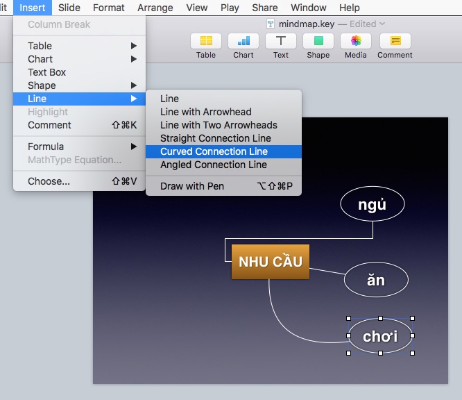 Mỗi phần mềm mỗi chức năng, trong đó keynote rất được chú ý bởi các hiệu ứng trình chiếu chuyển động rất ấn tượng. Sau vài ngày sử dụng, mình phát hiện ra Keynote có thể vẽ được Sơ Đồ Tư Duy (mindmap) khá đơn giản và thuận tiện mà không cần đến phần mềm chuyên dụng nào khác.