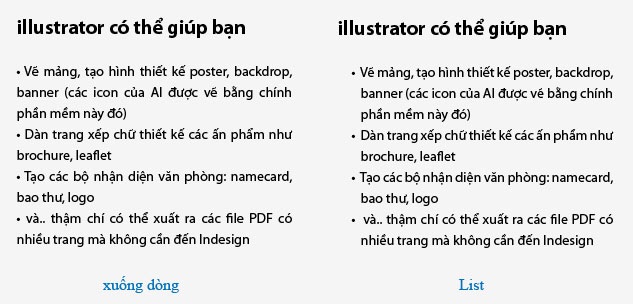 - Khối text bên trái là đoạn text bình thường, nếu bạn có cố gắng tạo 1 list thủ công thì các dòng dưới cũng tràn ra tận bullet (vì bullet trong trường hợp này cũng được xem như 1 ký tự)