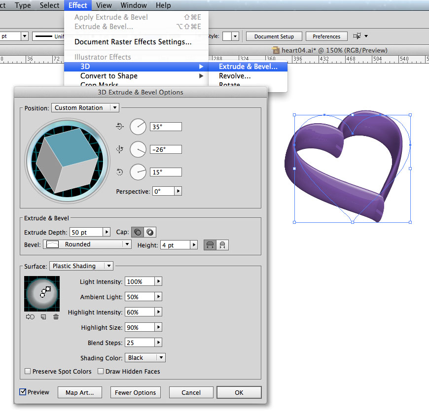 Chọn Effect > 3D > Extrude & Bevel để mở hộp thoại 3D extrude chỉ theo hình minh hoạ