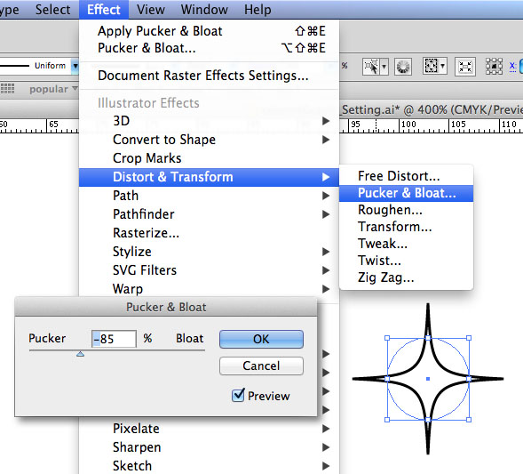 - Vào Effect > Distort & Transform > Pucker & Bloat… áp giá trị -85 (xem)