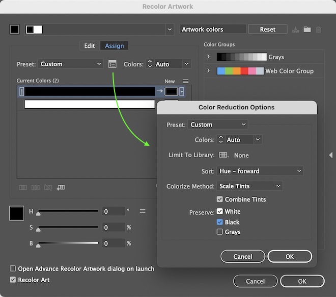 Là do mặc định Ai khóa màu Đen và Trắng. Bỏ kiểm White và Black trong nút Color Production Options