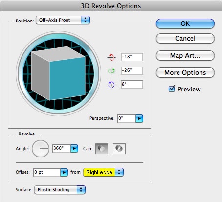 - Trong hộp thoại 3D revolve: kiểm chọn preview và click Map Art..