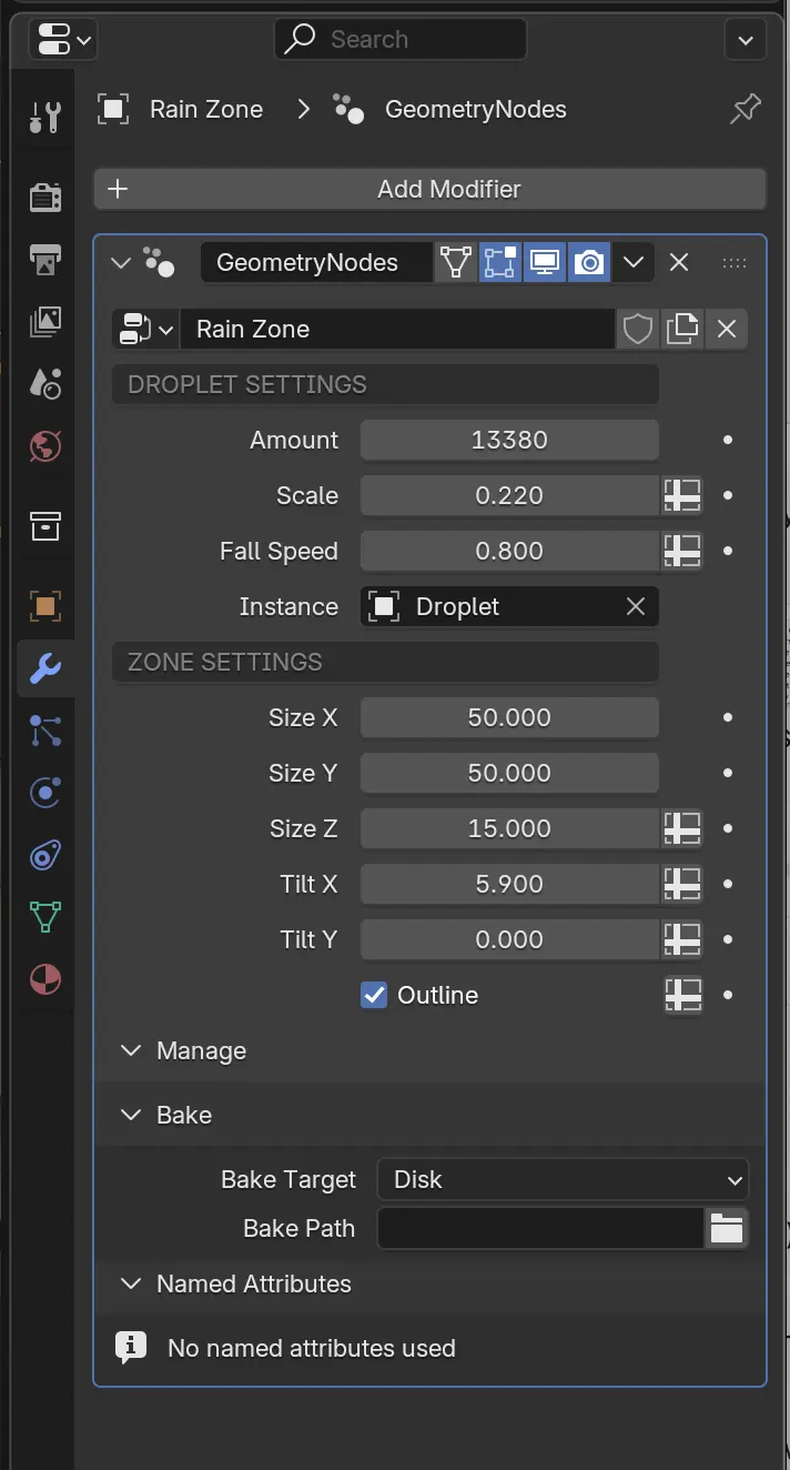 Để điều chỉnh, click chọn Rain zone và mở Modifier