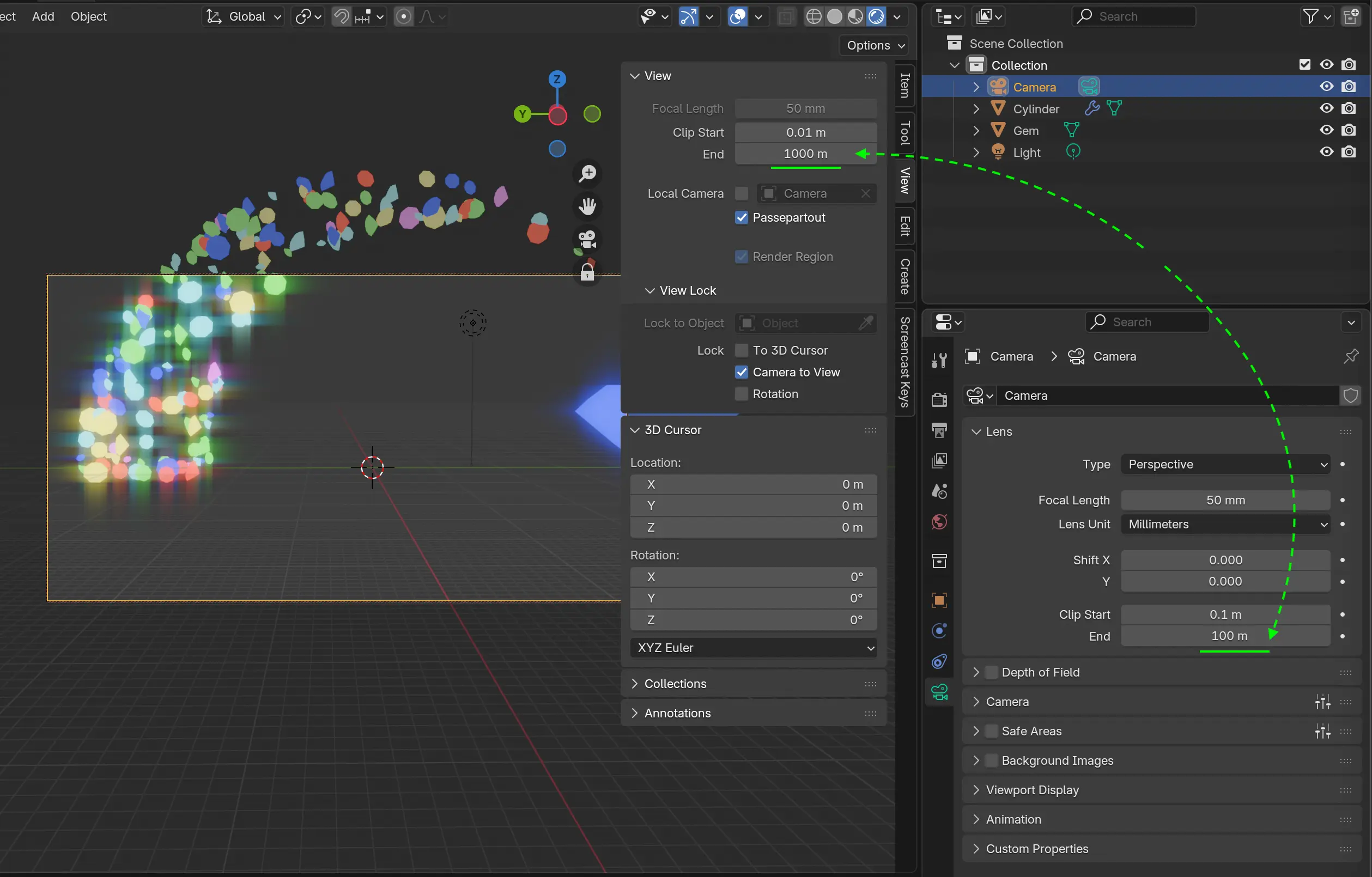 Chỉnh End hoặc Clip Start trong Properties: Camera bằng với End (hoặc Clip Start) trong Side bar: View. (video)