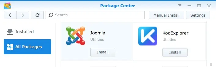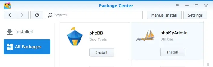 Tương tự như trên, bạn cài tiếp phpMyAdmin từ trong Package Center. Đăng nhập vào phpMyAdmin với