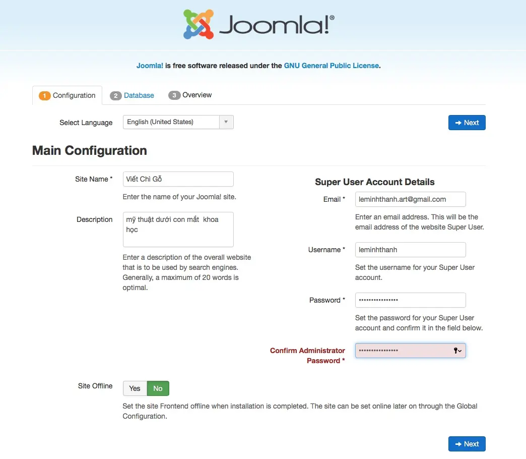 - Super User Acccount Details: phần khai báo account đăng nhập vào back-end joomla người quản trị (administrator) quyền cao nhất