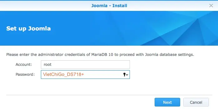 Chọn MariaDB10 trong Package Center, click install và nhập password. Lưu ý là pass này sẽ là pass truy cập vào phpMyAdmin và Joomla. Nếu bỏ trống thì những cái kia cũng bỏ trống.