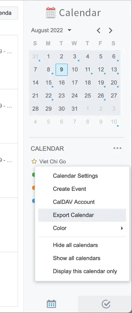 Và để export calendar nào bạn mở option menu bằng cách click vào tam giác nhỏ bên phải calendar đó trong sidebar bên phải giao diện.
