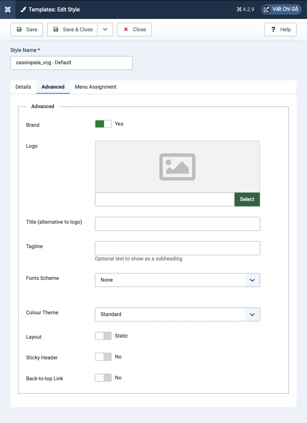 - Chọn template defaul. Ví dụ Cassiopeia > Advanced > bật Sticky Header