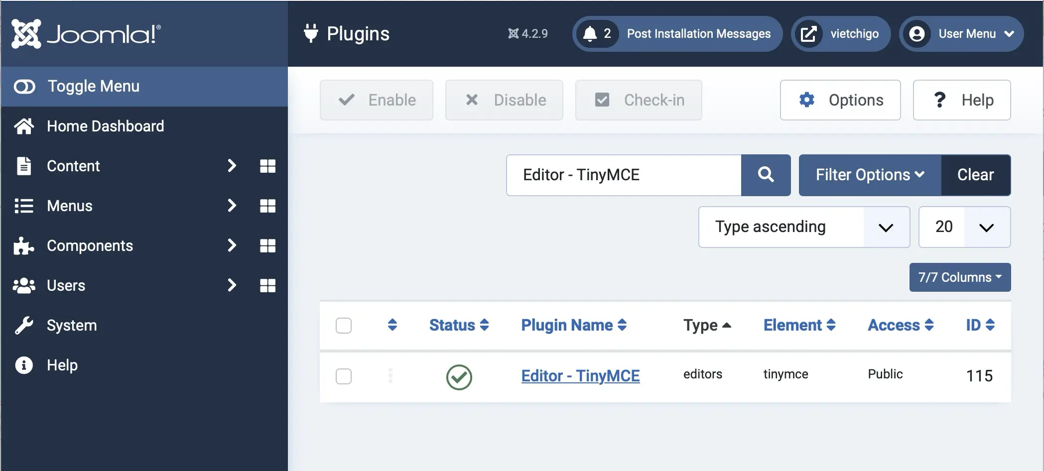Bước 2 - Trong Plugins, tìm Editor - TinyMCE