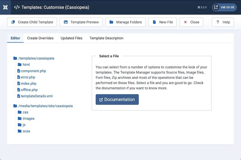 Từ đây bạn có thể tạo Template Child hoặc chỉnh sửa Overrides