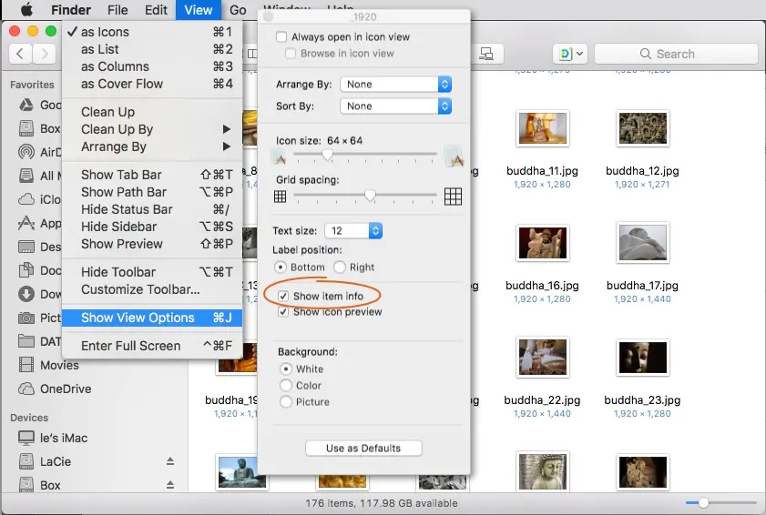 Hiển thị kích thước ảnh ở chế độ icon Vào View > Show view option. Kiểm Show item info