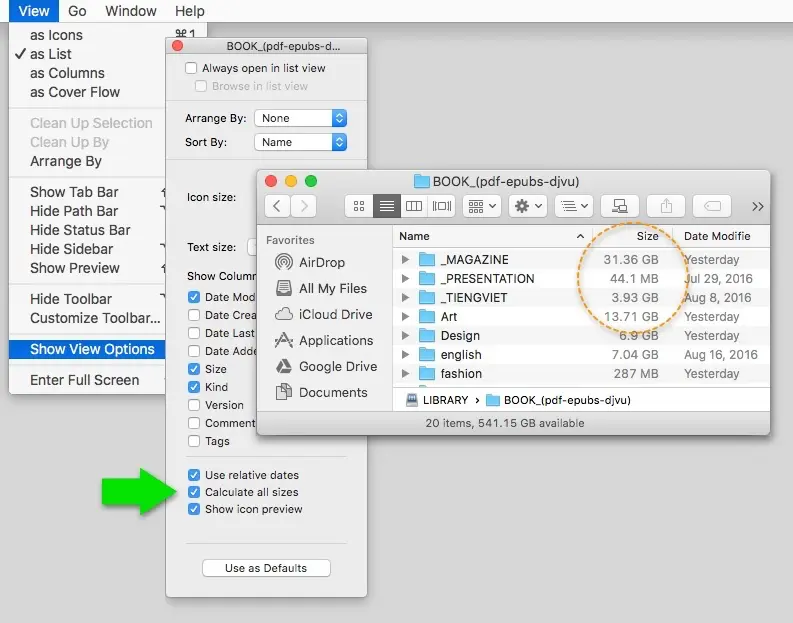 icon, list, column, cover flow.. Chế độ icon ở Mac tương tự như thumbnail ở Window. Các tùy chỉnh 4 chế độ trên trong View > Show view option