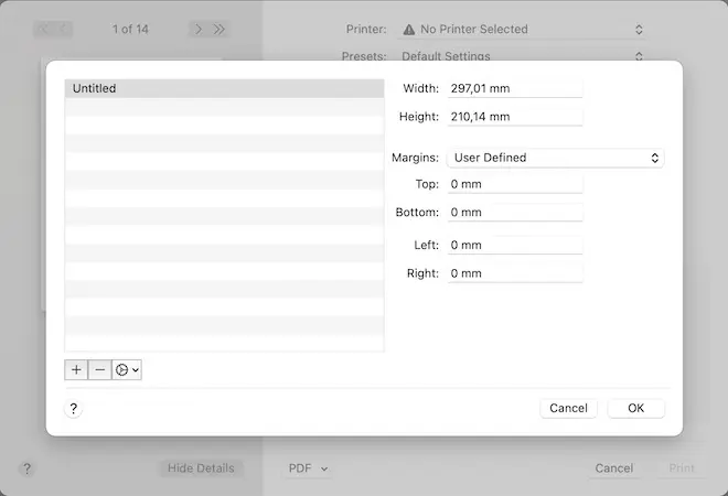 Chọn Page Size > Manage Custom Sizes và nhập Page size vừa với kích thước ảnh. Nhớ giảm margin về 0