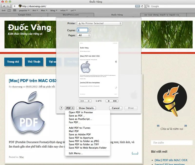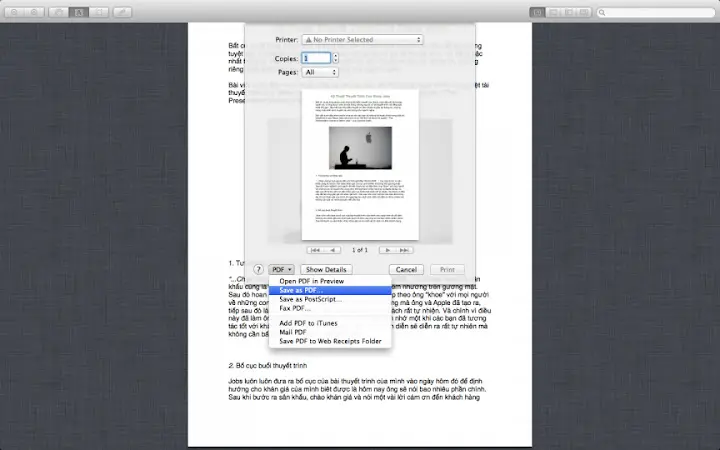 Chọn File trên thanh điều khiển ở bất cứ ứng dụng nào có thể in được như hình 1 (tôi minh hoạ bằng ứng dụng Preview), chọn Print và Save as PDF file. Còn gì đơn giản hơn nữa.