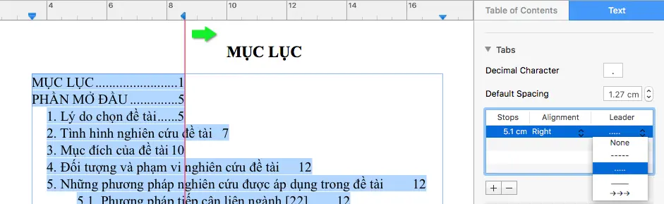 Bước 3: Chèn đường dấu chấm giữa đề mục và số trang