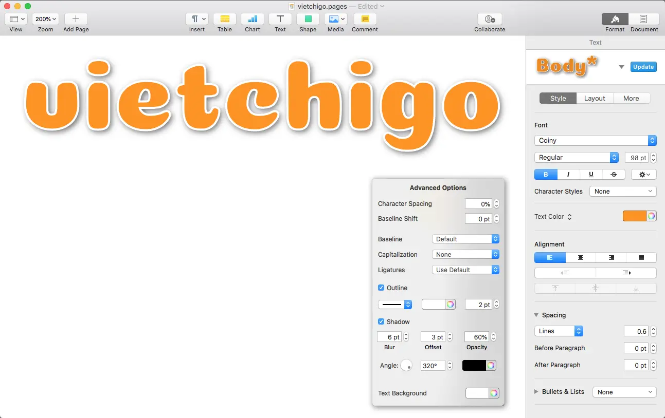 Sẽ là thiếu sót nếu không nói đến một hiệu ứng chữ ấn tượng (mà cực kỳ đơn giản trên Pages 8.1) đó là hiệu ứng bóng đổ - Drop Shadow