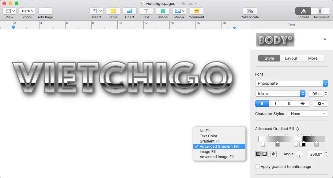 Sau khi phát hiện ra Pages 8.1 trên MacOS có thể thêm được nhiều thẻ màu trong Advanced Gradient Fill, mình thử tạo 1 hiệu ứng chữ ấn tượng: Chrome text xem thế nào