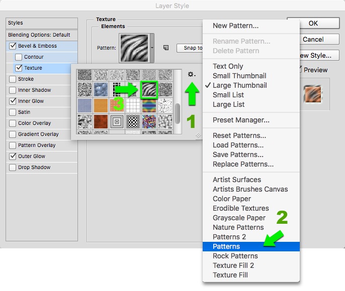 Chú ý: Có thể thư viện texture của bạn không có các mẫu như trong minh hoạ. Bạn có thể thêm vào bằng cách click nút option (Số 1, có hình bánh răng nhỏ) chọn Patterns trong menu như hình dưới đây